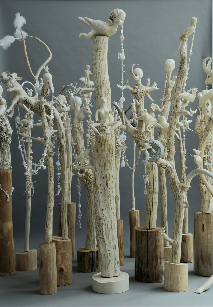 Bois flotté d’abord, glané dans les mares, objets choisis parmi l’hétéroclisme des brocantes deviennent êtres de métamorphoses. Mais l’alchimie qui transforme petits paniers, nichoirs à oiseaux, yeux de verre, têtes de poupons, récipients divers, racines d’arbres, cauries, corail jusqu’à des coloquintes en fétiches fait écho à la capacité de ces derniers dans le passé à incarner le monde de l’invisible. Le travail de la plasticienne apparaît ainsi comme la métaphore concrète d’une transcendance à la racine du sacré et de toute création.