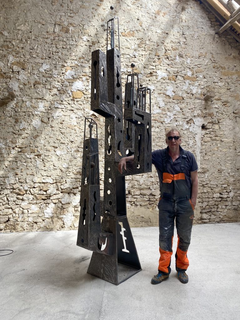 A l’atelier je réalise des sculptures « durables » en métal en utilisant l’acier pour ses qualités contradictoires souplesse-rigidité, finesse-épaisseur.